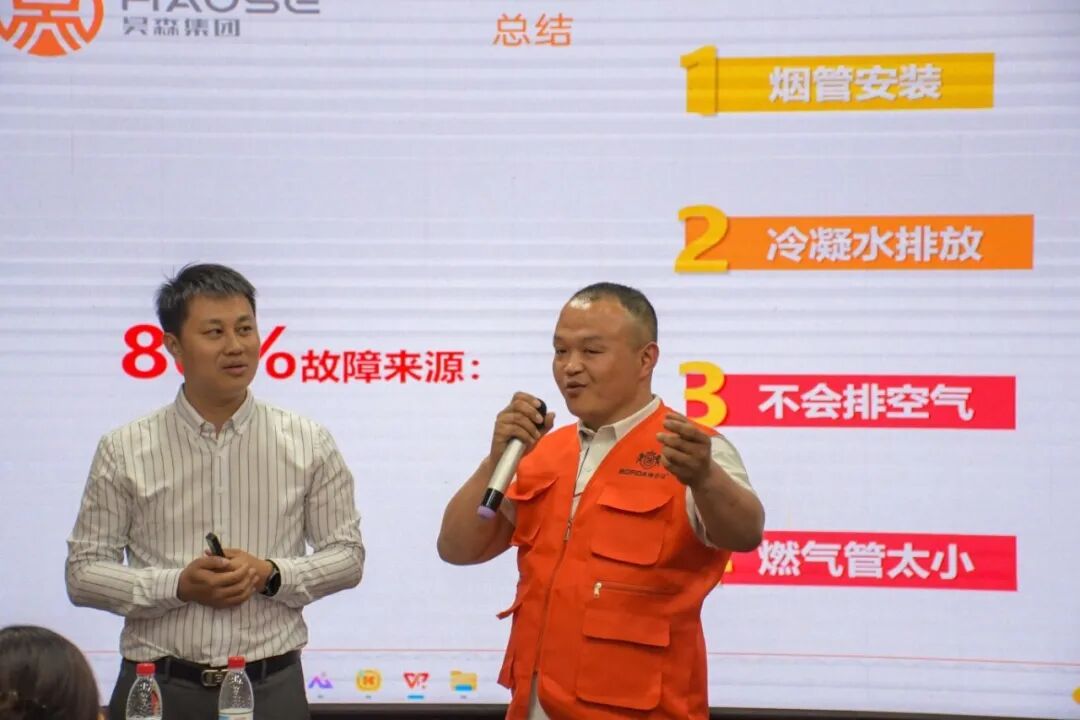 黄一波以”抓细节、重规范”为原则,针对全预混壁挂炉安装调试的核心环节展开深度教学。从全预混的产品特性到安装时候需要注意的小细节,黄一波逐一耐心讲解,这种看得见、学得会的技术赋能,正是昊森深耕终端服务的真实写照。