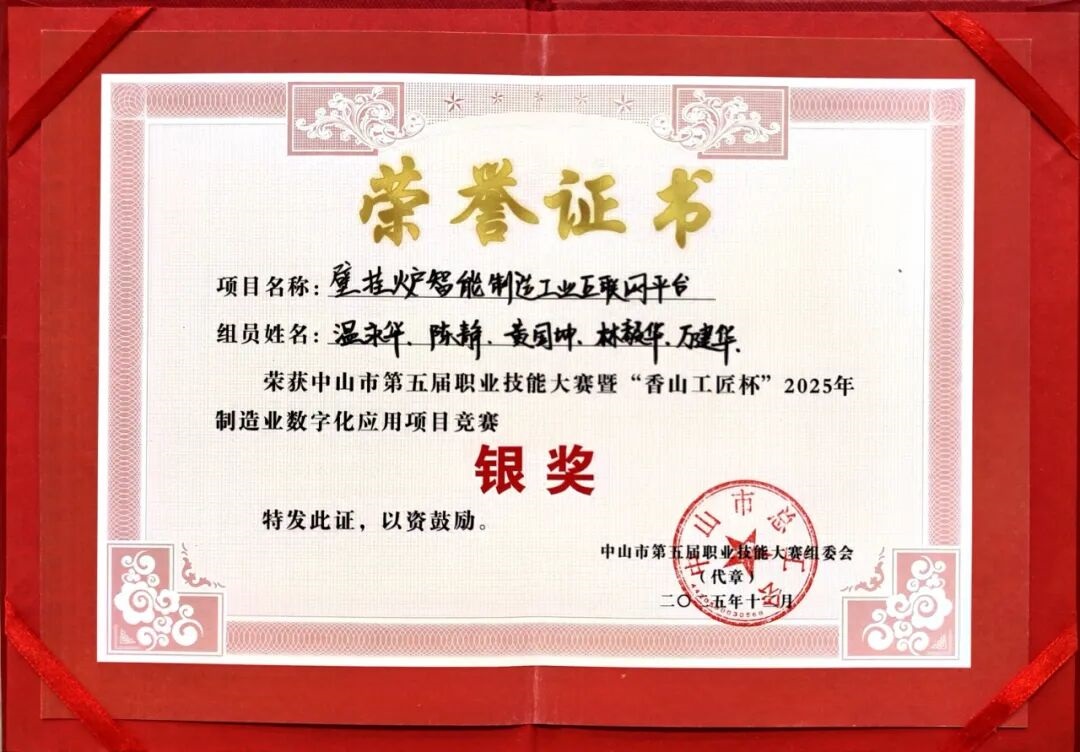 本次竞赛由中山市总工会、中山市人力资源和社会保障局、中山市工业和信息化局联合主办,聚焦制造业数字化转型升级,吸引全市35支精英队伍参赛。经过激烈角逐,广东昊森热能设备有限公司携手正和数智科技(深圳)有限公司中山分公司,凭借《壁挂炉智能制造工业互联网平台》项目脱颖而出,荣获大赛银奖。